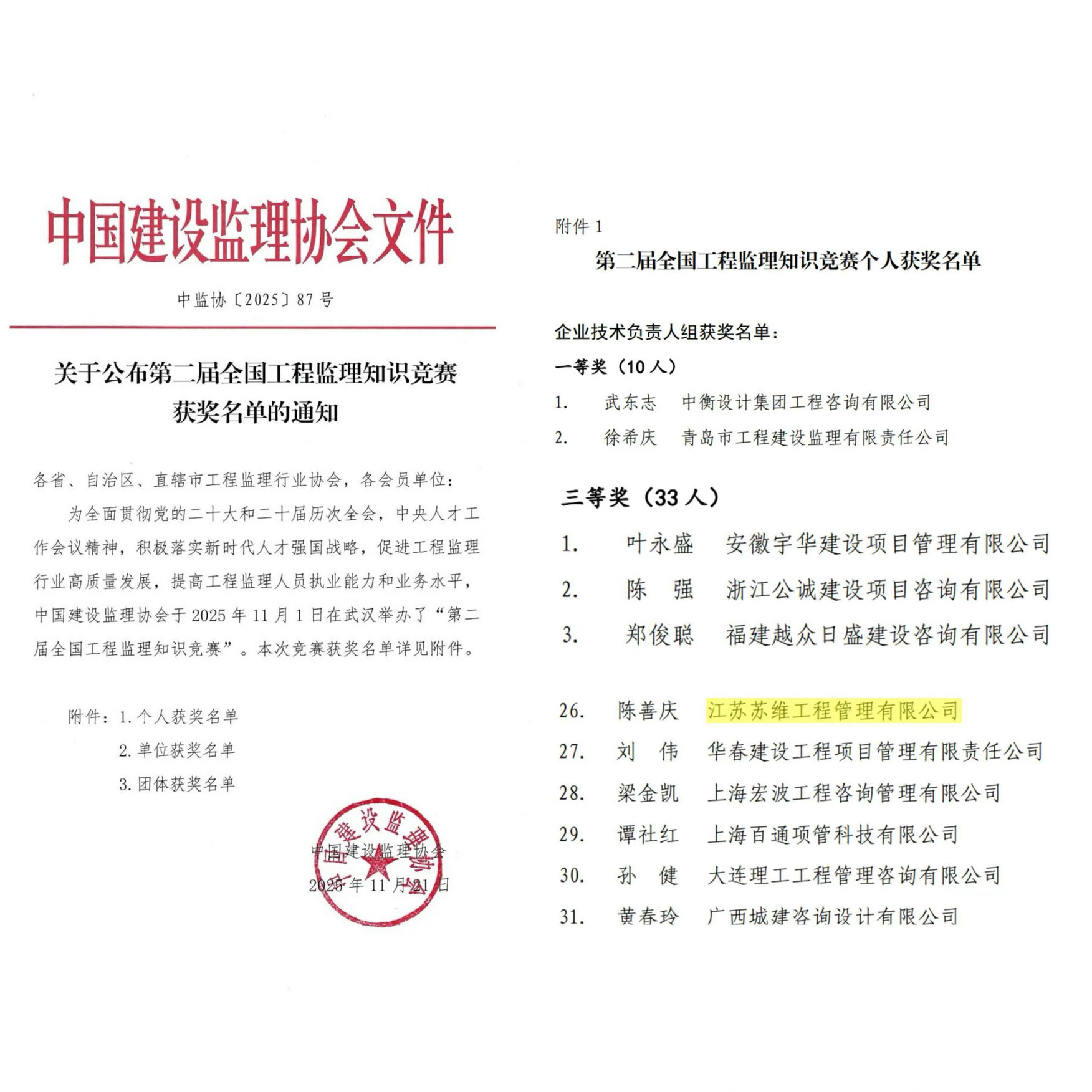 我公司总工程师陈善庆此前凭借深厚的专业功底在江苏赛区选拔赛中脱颖而出,斩获赛区三等奖并晋级全国总决赛。此次,在全国总决赛的赛场上,面对各地顶尖选手的激烈角逐,陈总工沉着应战,凭借二十余年一线工程监理经验,精准破解各类难题,尽显深厚的行业素养与高效的问题处置能力,最终荣获全国总决赛企业技术负责人组三等奖,扬州市仅一人,为公司赢得了荣誉。