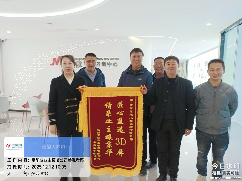 2025年12月12日,扬州京华城业主代表周总专程到访公司,将一面绣有“匠心监造3D屏,情系业主暖京华”的锦旗郑重赠予公司,对我司在京华城3D裸眼巨屏项目中的卓越监理服务表示由衷感谢,并现场表达“下个项目希望原班人马继续合作”的强烈意愿。