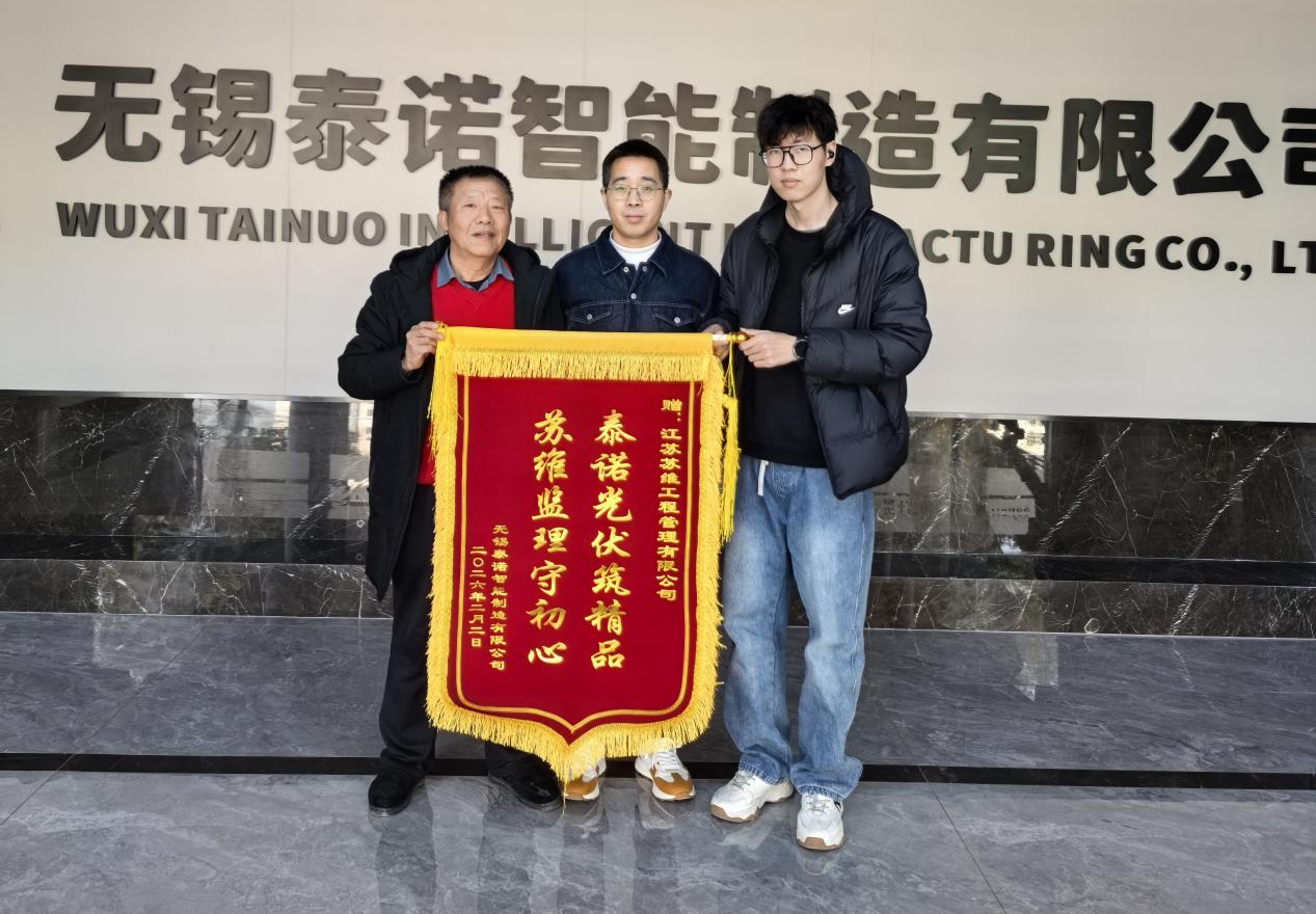 近日,由我公司承监的无锡泰诺智能制造公司1.26MW分布式光伏项目喜获业主赠送锦旗,上书"泰诺光伏筑精品,苏维监理守初心",高度肯定了我公司项目监理团队的专业服务与辛勤付出。