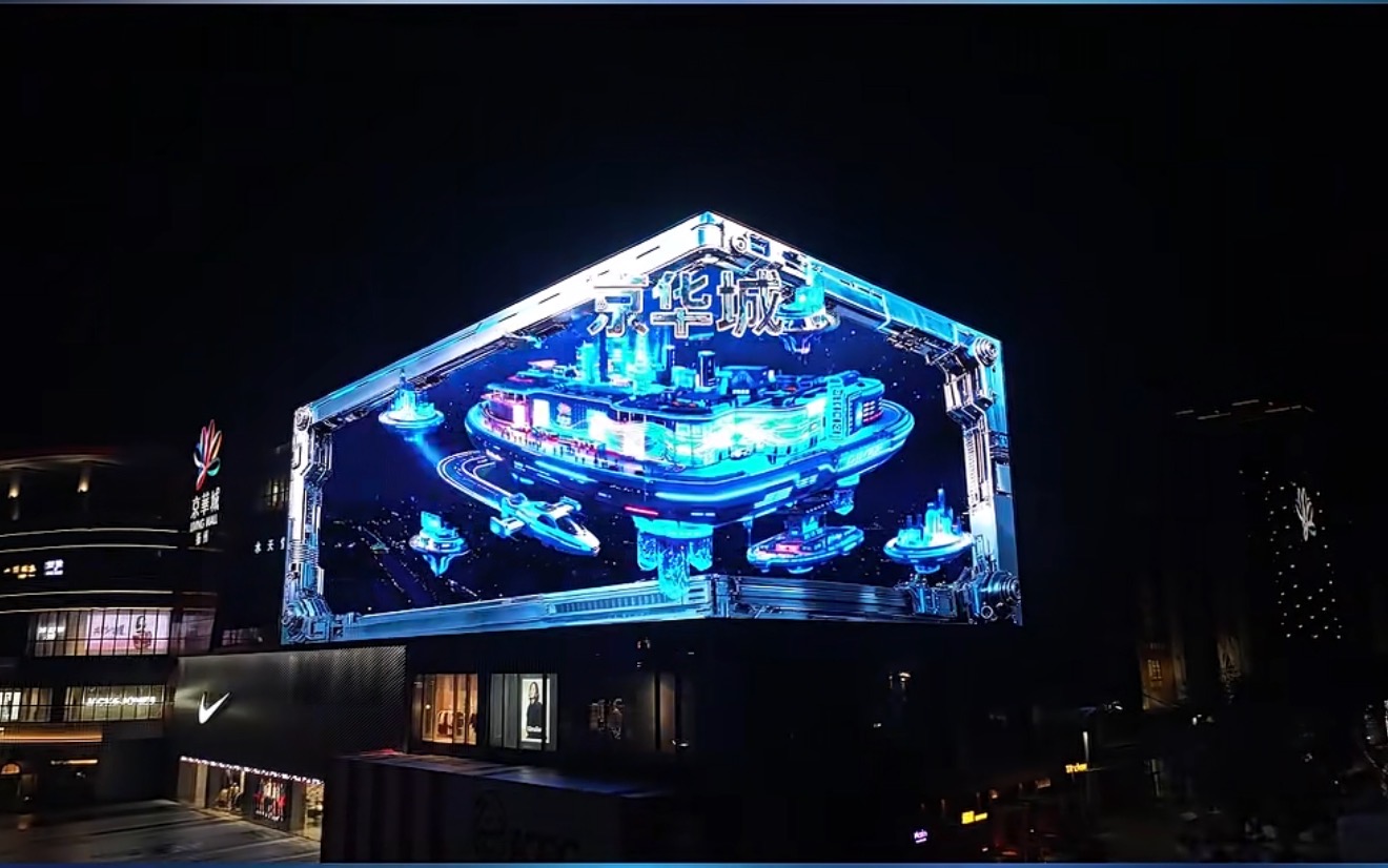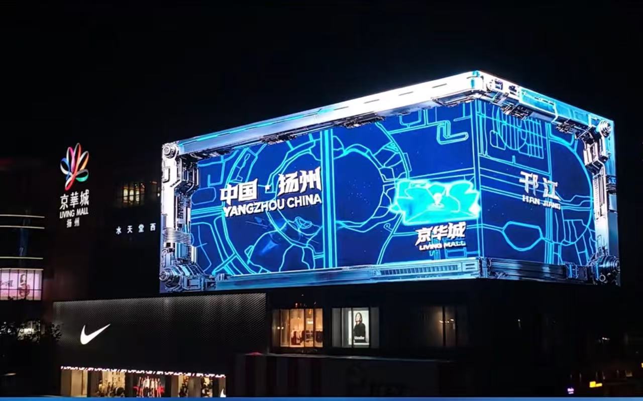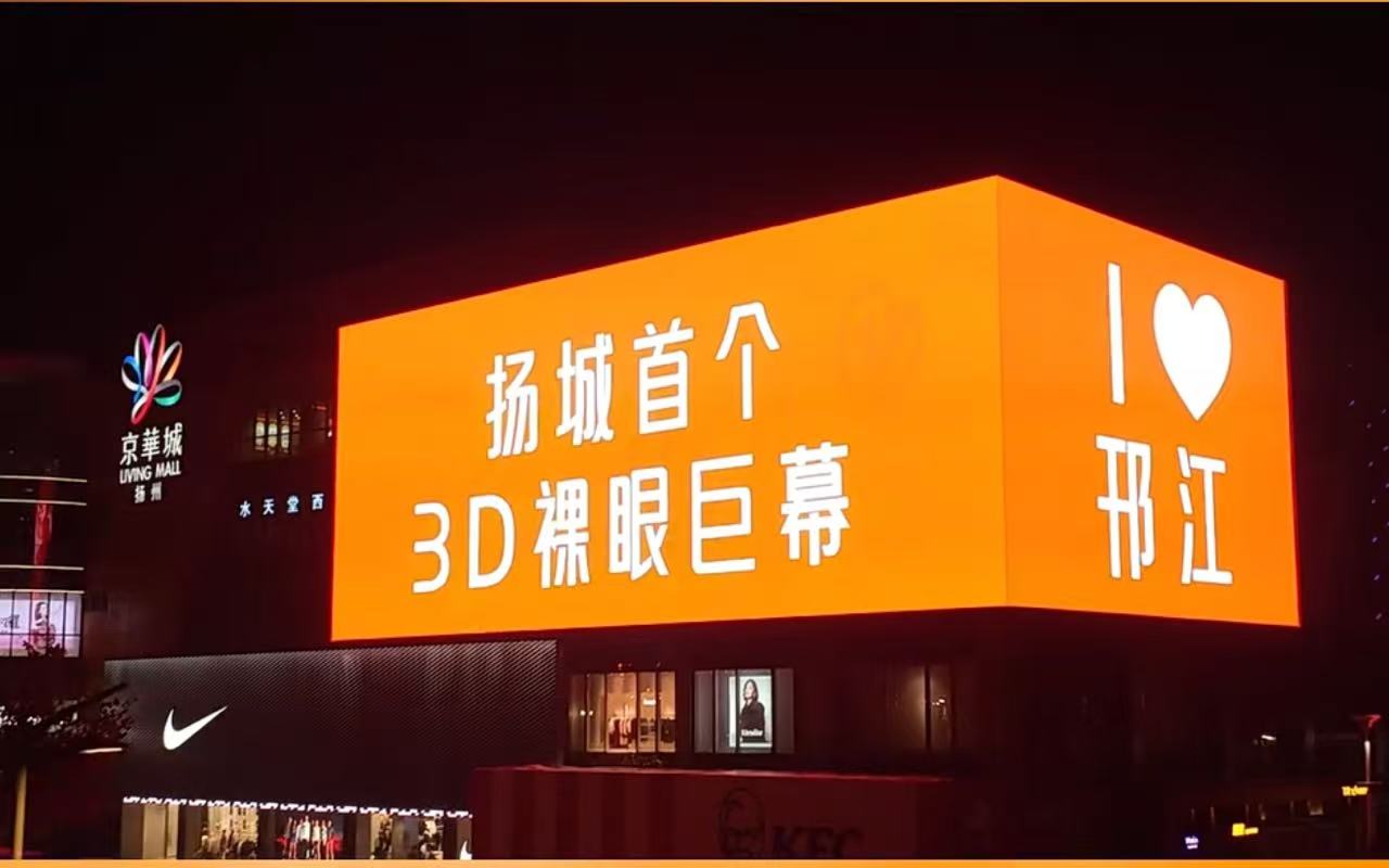 该项目是扬州首个3D裸眼巨屏,也是目前江苏省面积最大、分辨率最高的裸眼3D大屏,总面积1200㎡,整体像素高达7500万,采用5500nit高亮户外P4技术,配备先进的8K图形卡点对点同步拼接技术。就在12月10日晚扬州京华城3D裸眼巨屏正式点亮,为观众带来震撼的视觉体验,成为扬州城市商业的新地标。