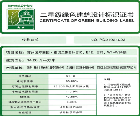 近期,由我司开展项目管理的苏州国寿嘉园·雅境二期项目,荣获二星级绿色建筑(证书编号:NO.PD21024023)。这一成果的取得,离不开项目团队在设计管理环节的精细化把控与创新实践,也彰显了养老建筑领域绿色设计管理的标杆水准。
